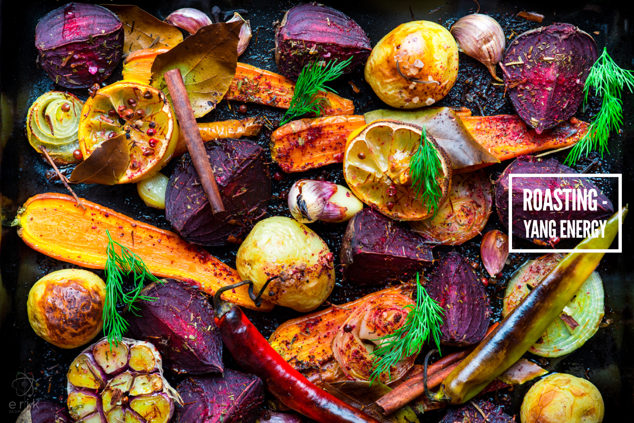Roasting foods adds yang energy to food regardless of what their temperature property are prior to roasting . For example if you have a cooling food like broccoli, roasting it will take away its “cooling property”. This is a good option for colder climates or winter seasons.