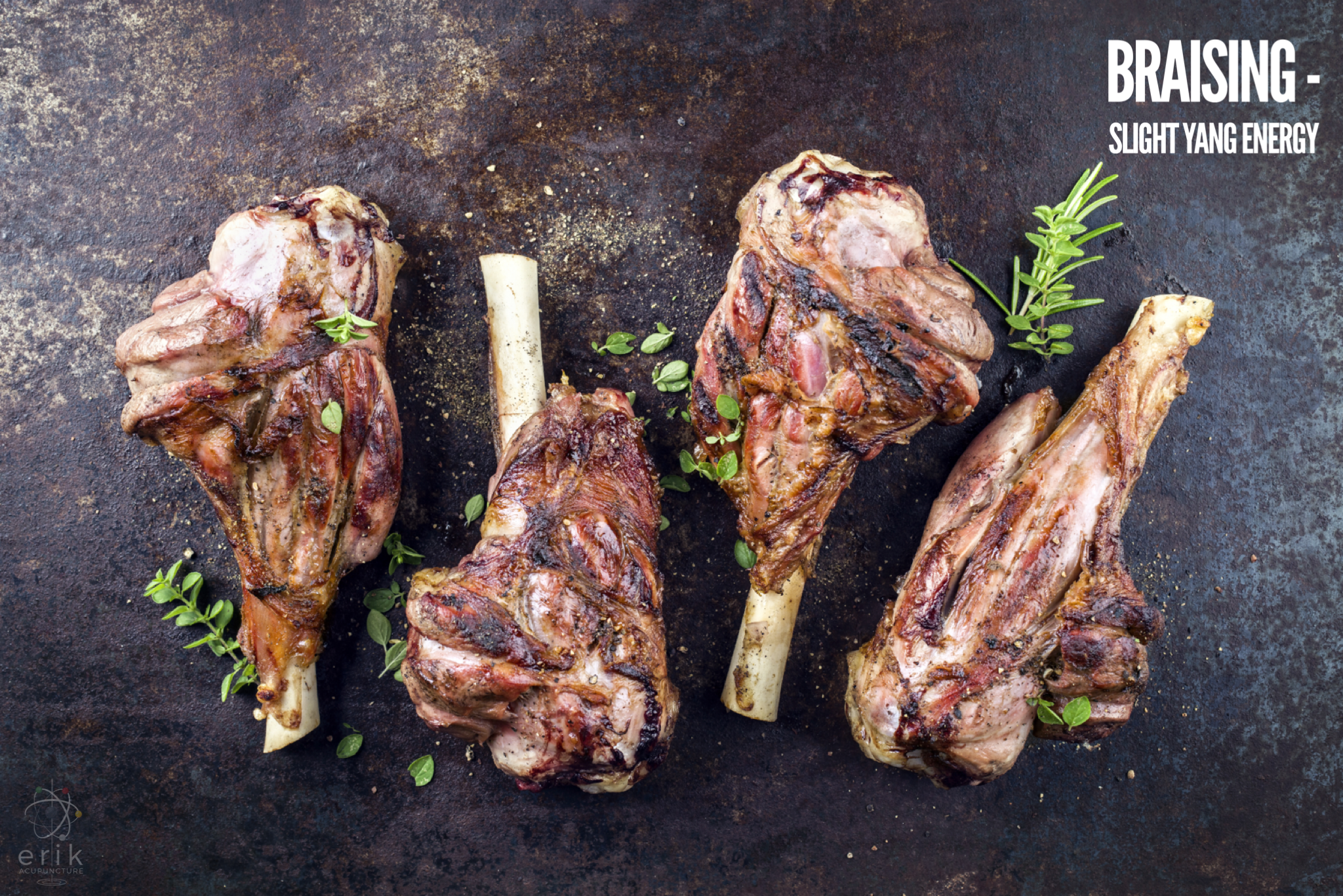 Braising food adds only a slight amount of yang energy to the food. It is commonly used in combination with “low and slow” cooking times (stews & soups). Braising utilizes reduced heat or yang energy making foods less likely to be damaged by destroying important enzymes. This method is common for many different foods (Meat, Vegetables, Fish)