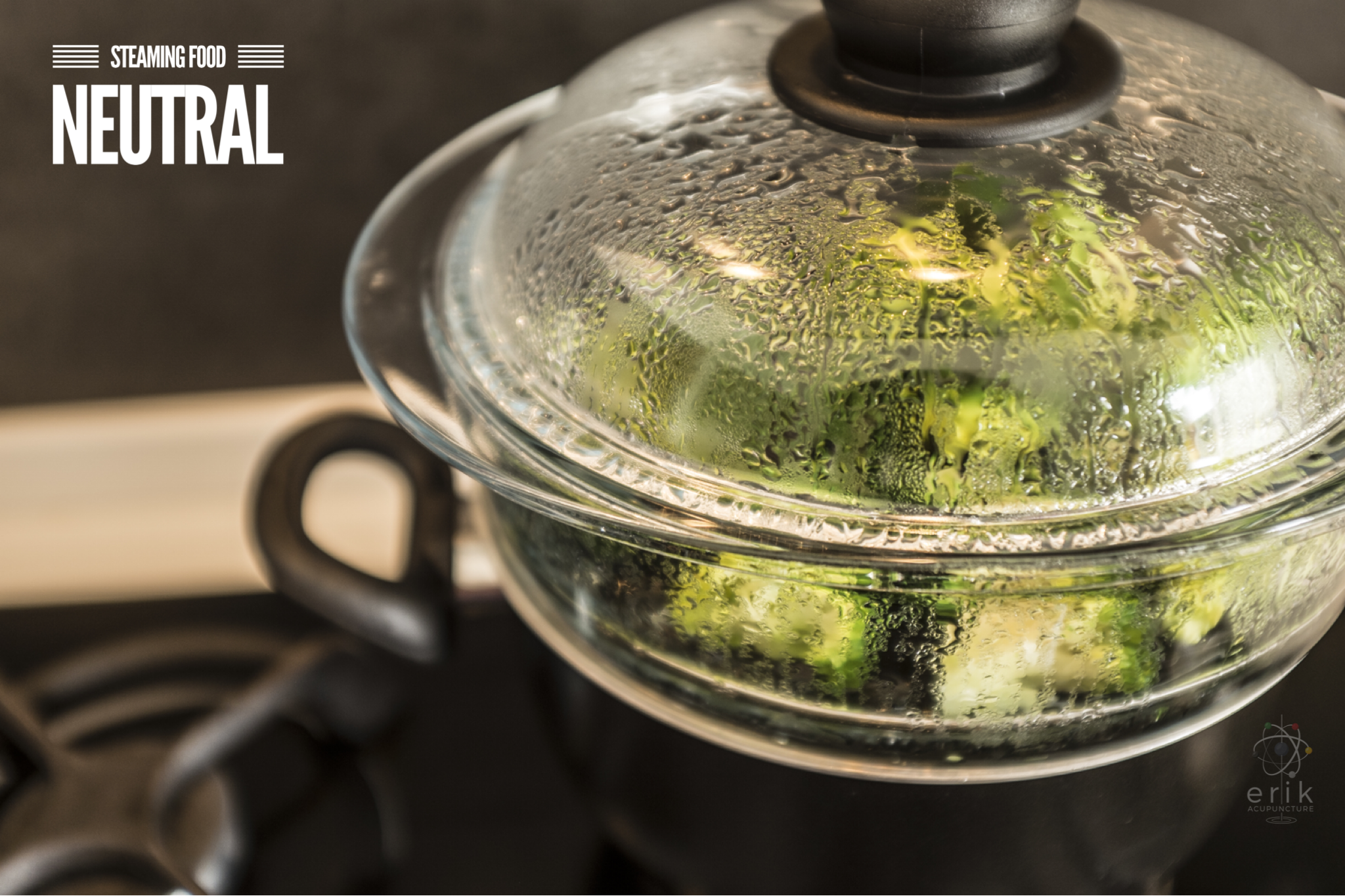 Steaming food is generally considered to be a neutral form of cooking as it does not typically change the yin (cooling) or yang (warming) characteristics of the food. However the structure of a food, yin (solid) and yang (soft) can change and will be affected by the length of time food is steamed.