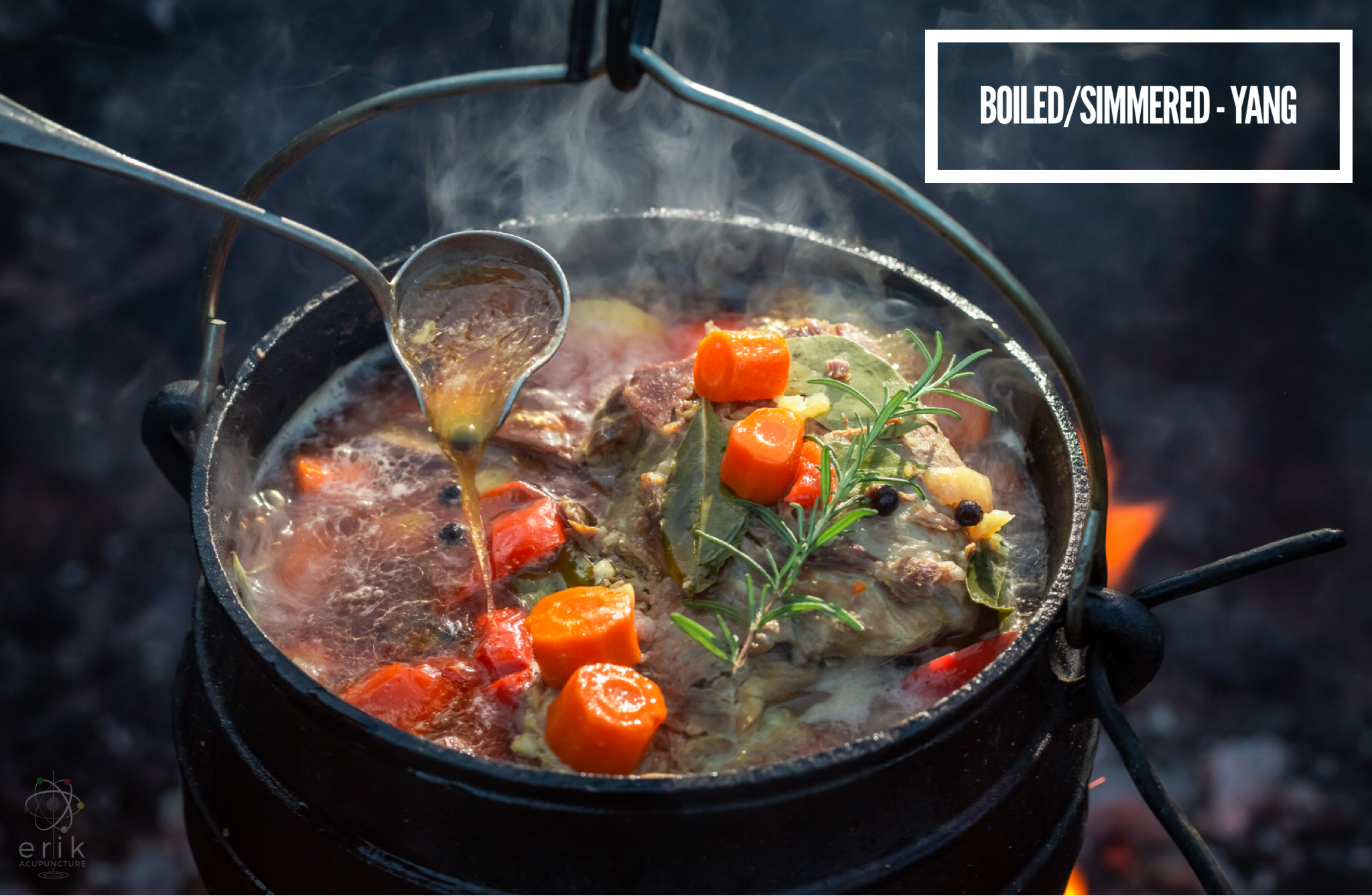 Boiling/simmering food adds yang energy. The amount of yang energy varies with how long the food is boiled/simmered. Cold seasons and climates are a great time of year to boil/simmer meals